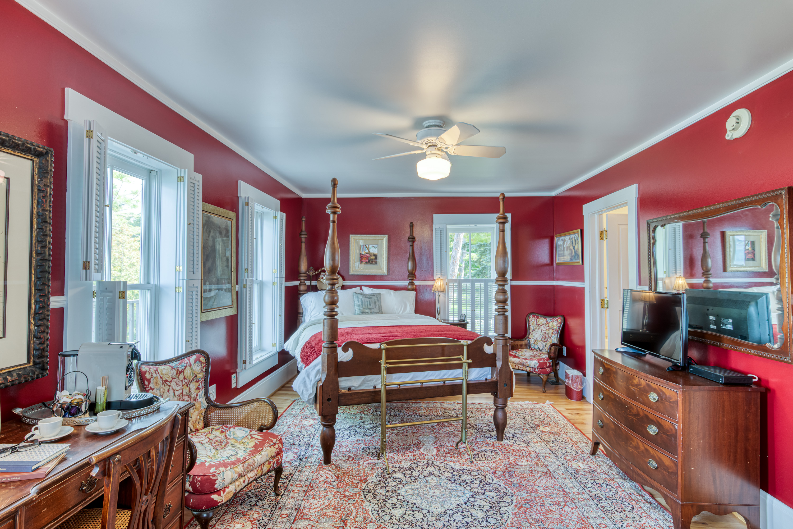 Of course there is the view, which is priceless and unforgettable. But take a moment to listen for the waves tapping at the shoreline below, the wind sifting through the pine trees just outside the windows. Ruminate upon it all from the comfortable sitting area, or succumb to the relaxing pleasures of the sumptuous four poster queen bed. Simply put, The Superior is a room for recharging and relishing. Provided as well is a private bathroom complete with luxurious shower, a soaking bath, and heated tile floors.